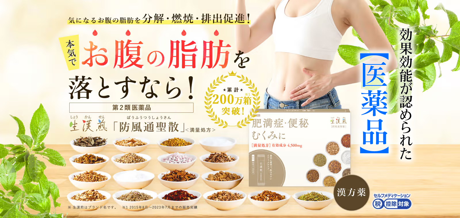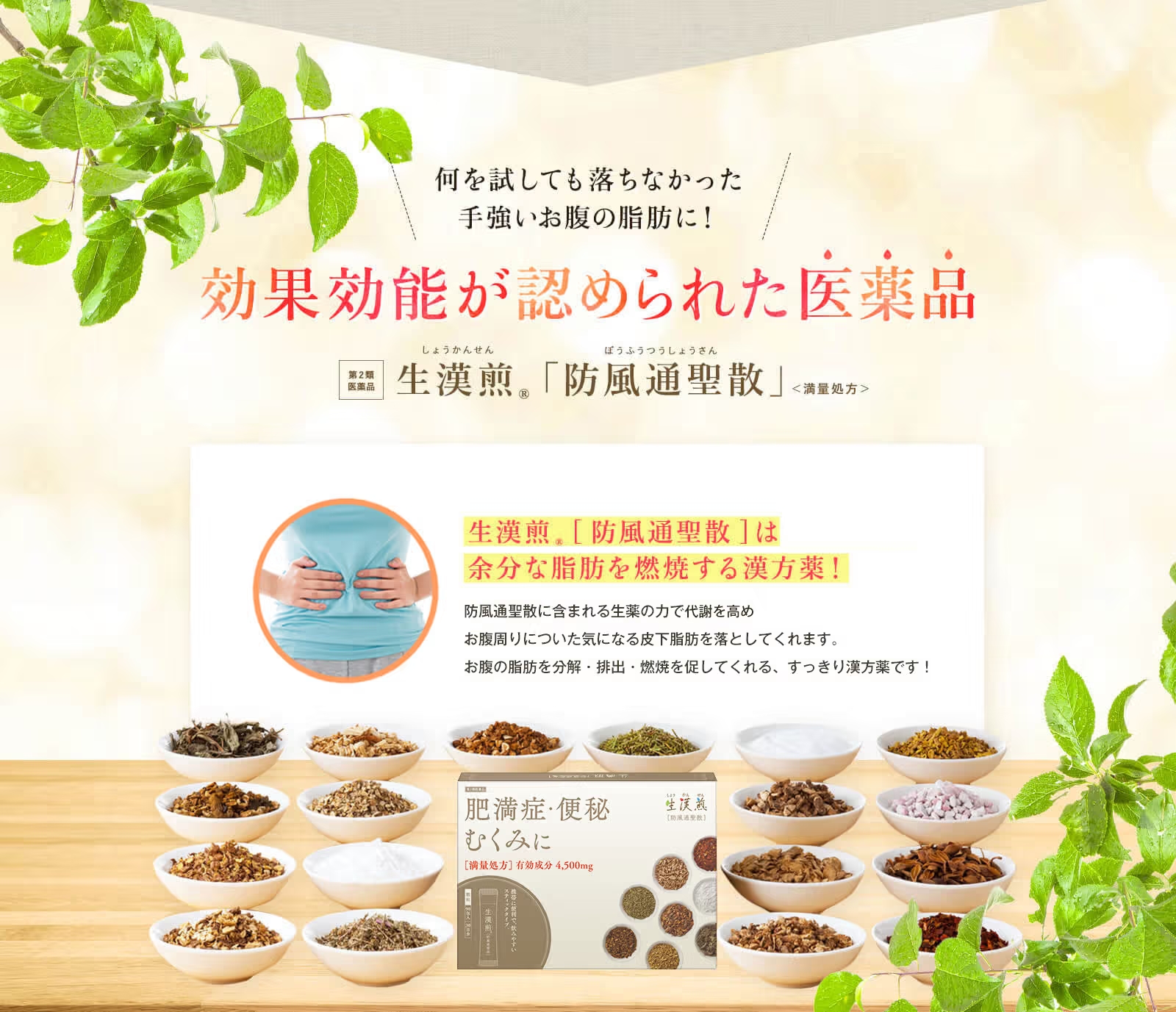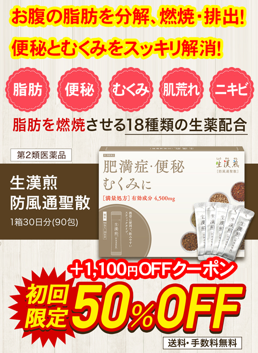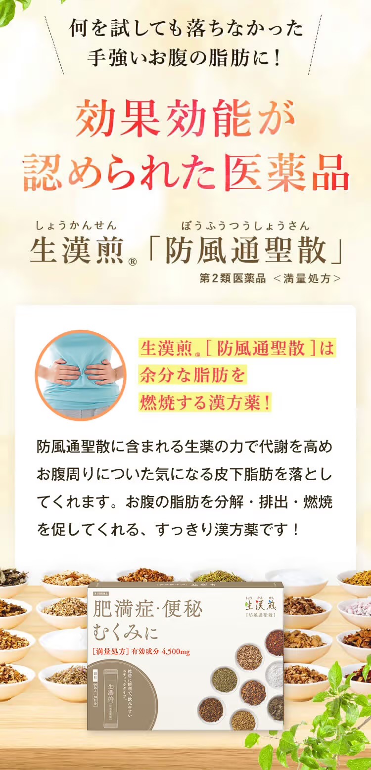 防風通聖散は、 漢方の古典書にも古くから記載されている「漢方薬」「医薬品」で、18種類の生薬が 余分な脂肪を分解・燃焼し、お腹周りについた皮下脂肪を落としてくれます。