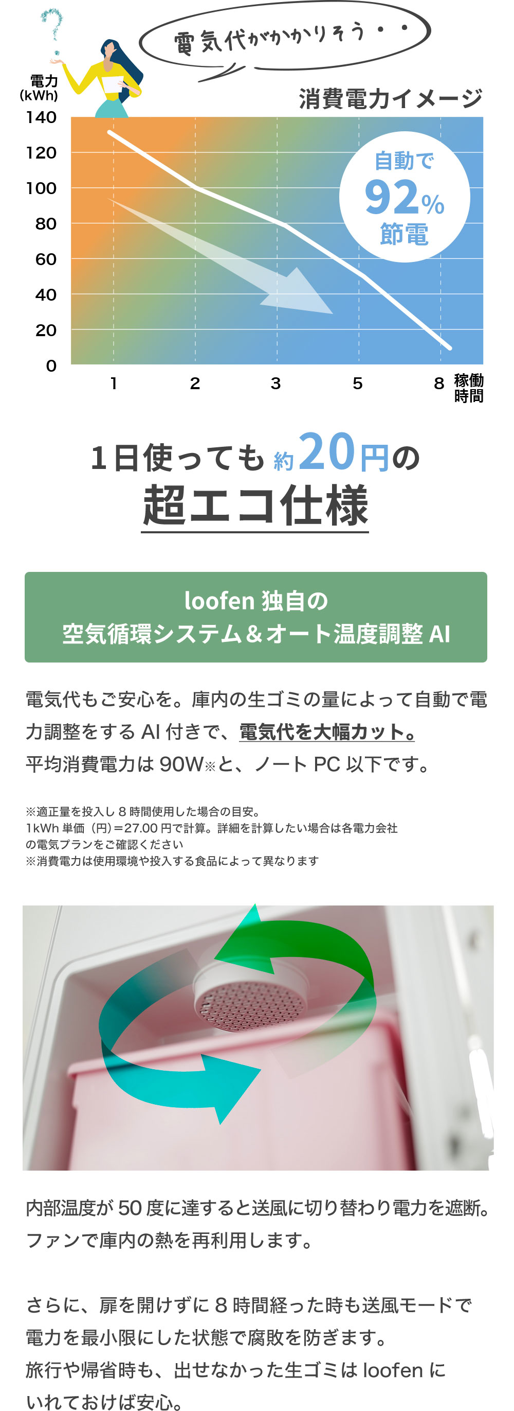 | 電力 | ◎10w~130w AIが自動調節 | 電気代 | ◎1日20円 |