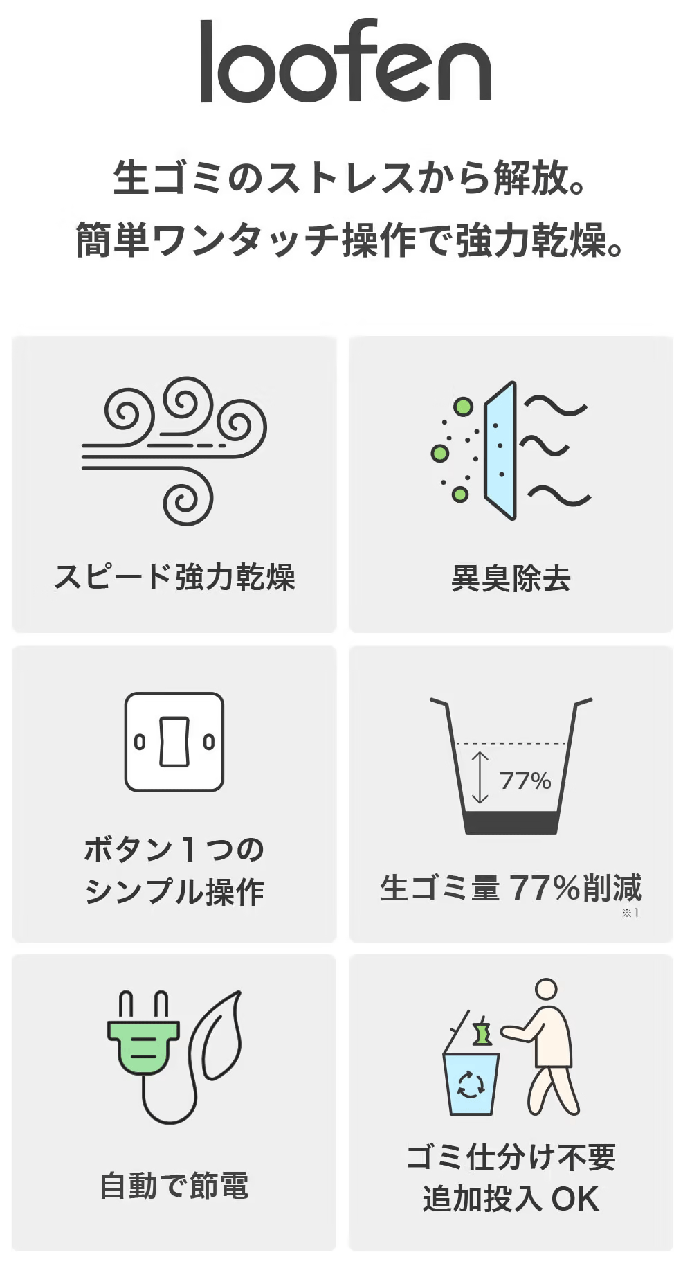 庫内のゴミの量に応じてloofen(ルーフェン)がパワーを自動調整してくれます。