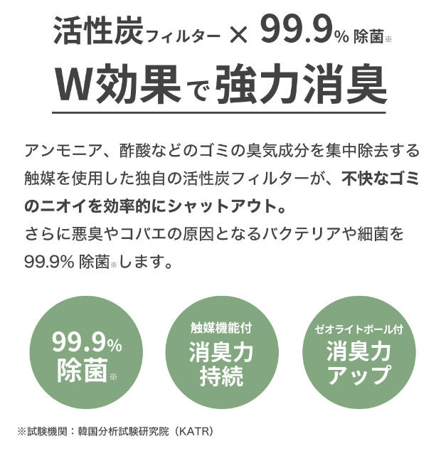 | ゴミの追加投入 | ◎いつでも追加投入可能 | 消臭・除菌 | ◎活性炭フィルターで99.9%消臭&除菌! |