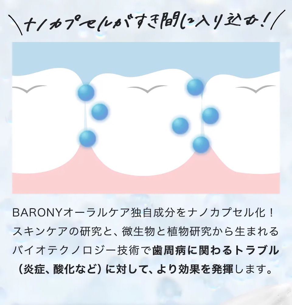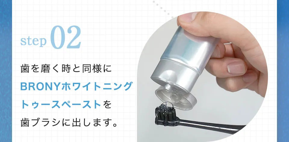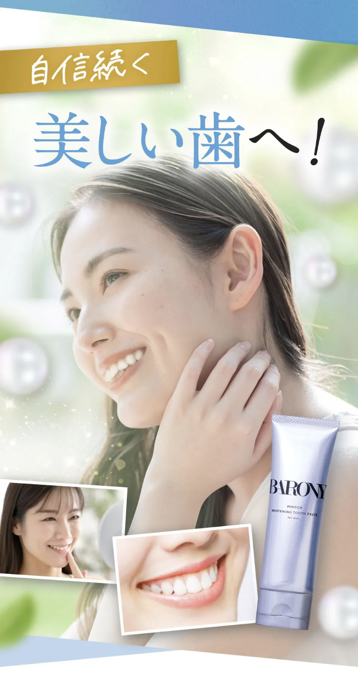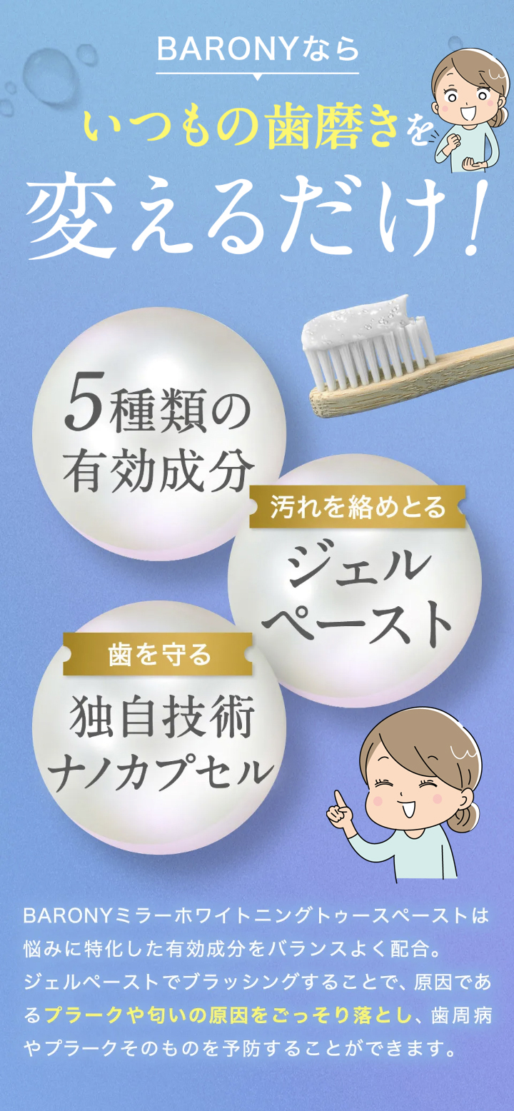 現在ご使用の歯磨き粉をBARONYミラーホワイトニングトゥースペーストに入れ替え ていただき、今ままで通り歯磨きしてください。 万が一お体に異変がございました場合は使 用をお控えください。