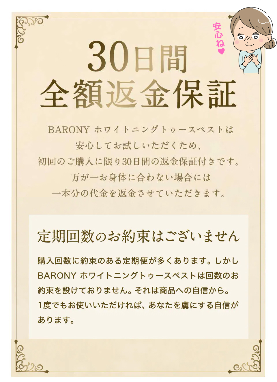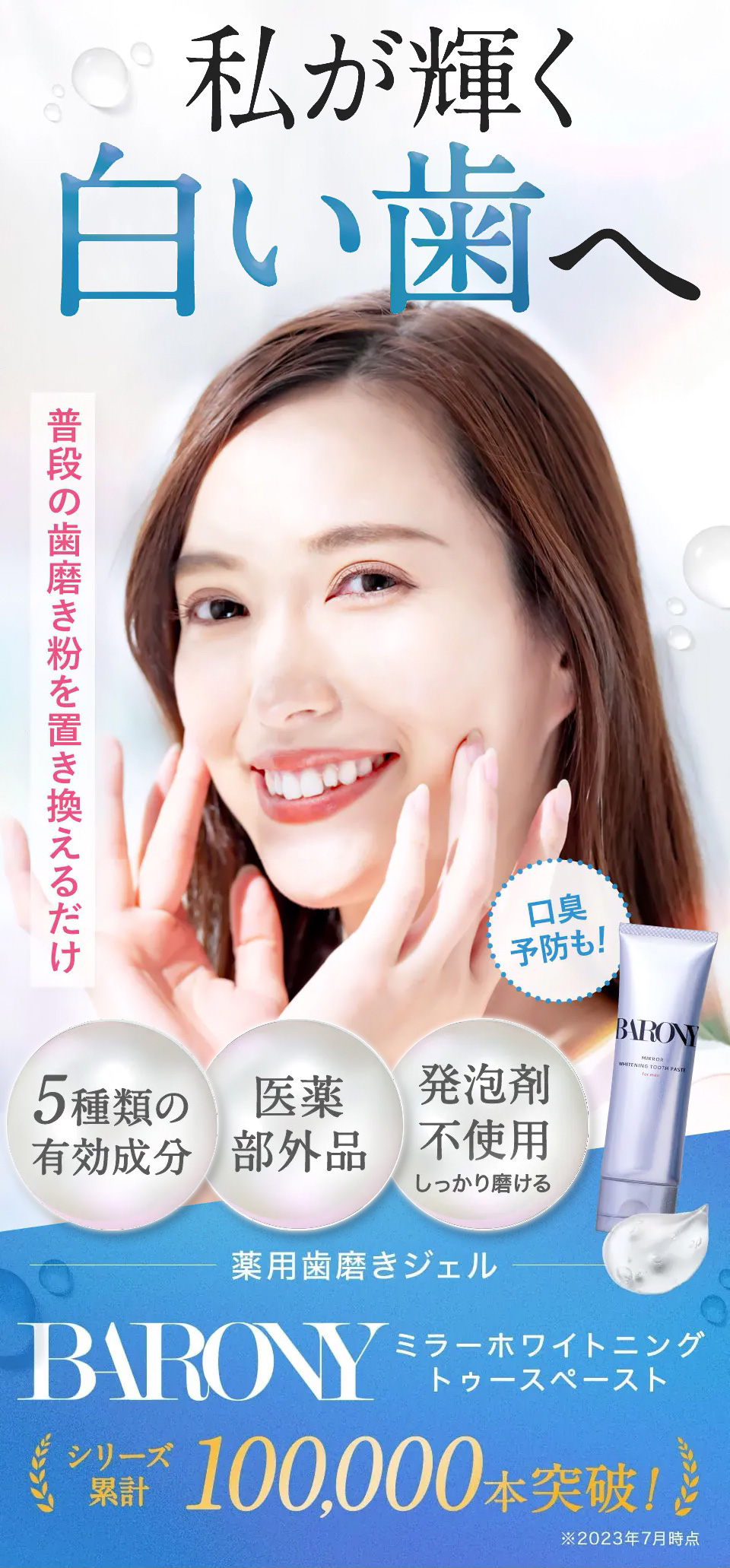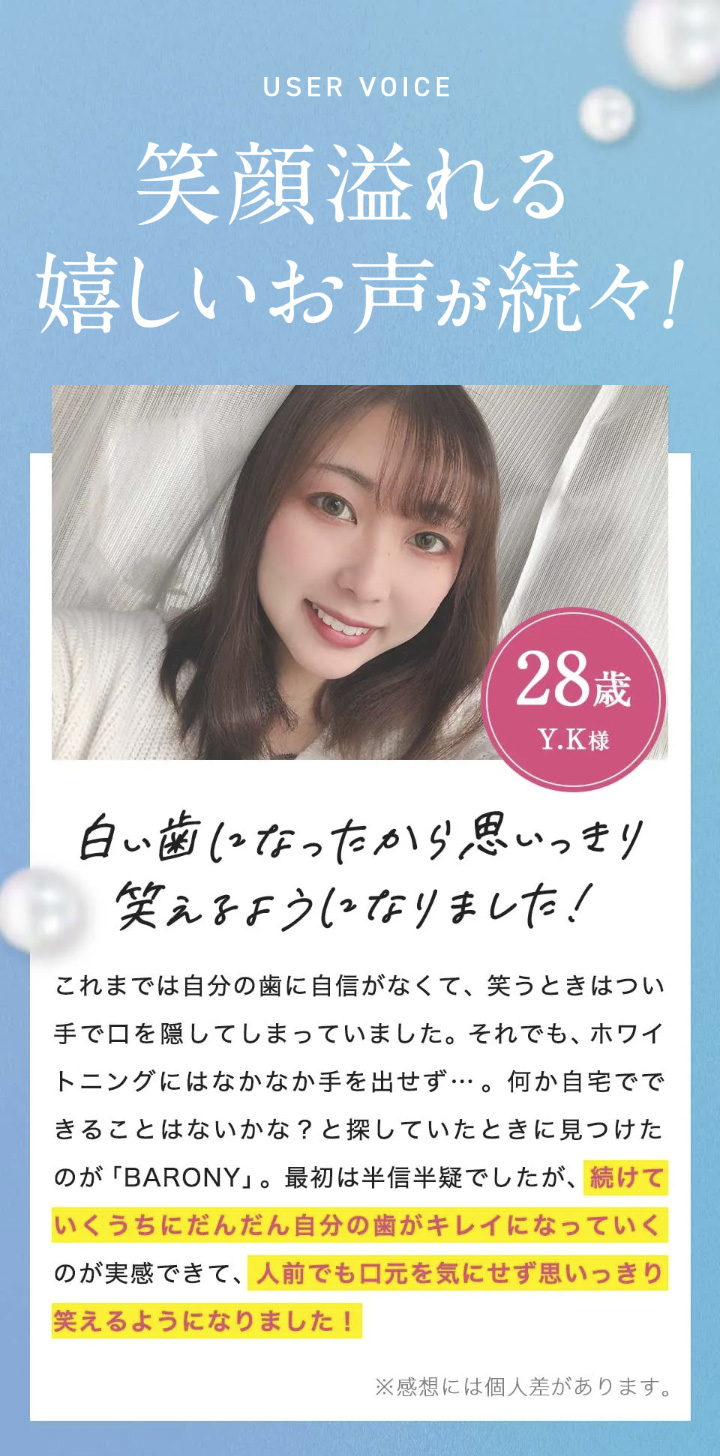 現在ご使用の歯磨き粉をBARONYミラーホワイトニングトゥースペーストに入れ替え ていただき、今ままで通り歯磨きしてください。 万が一お体に異変がございました場合は使 用をお控えください。