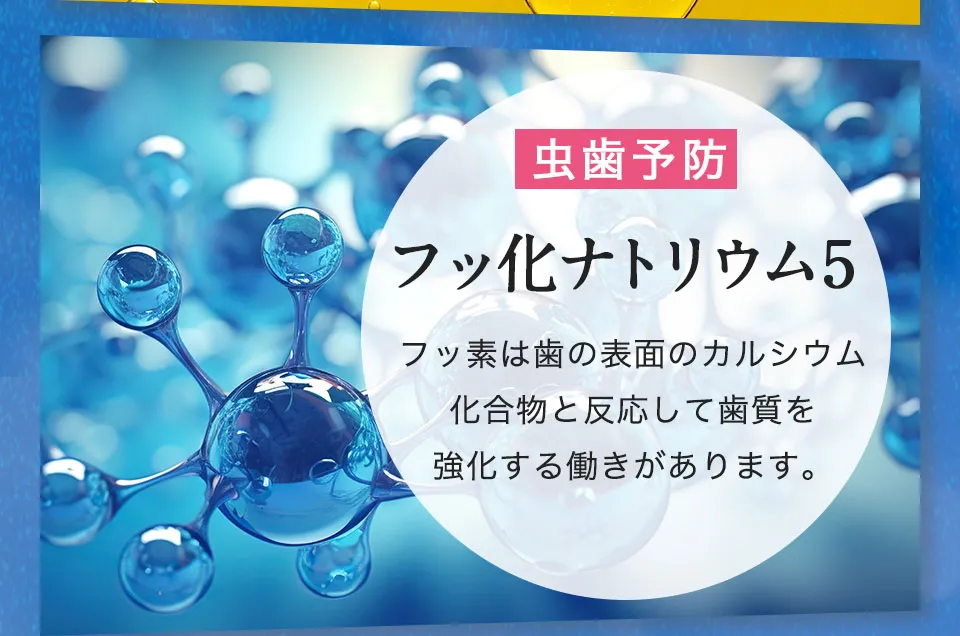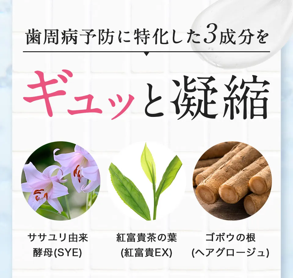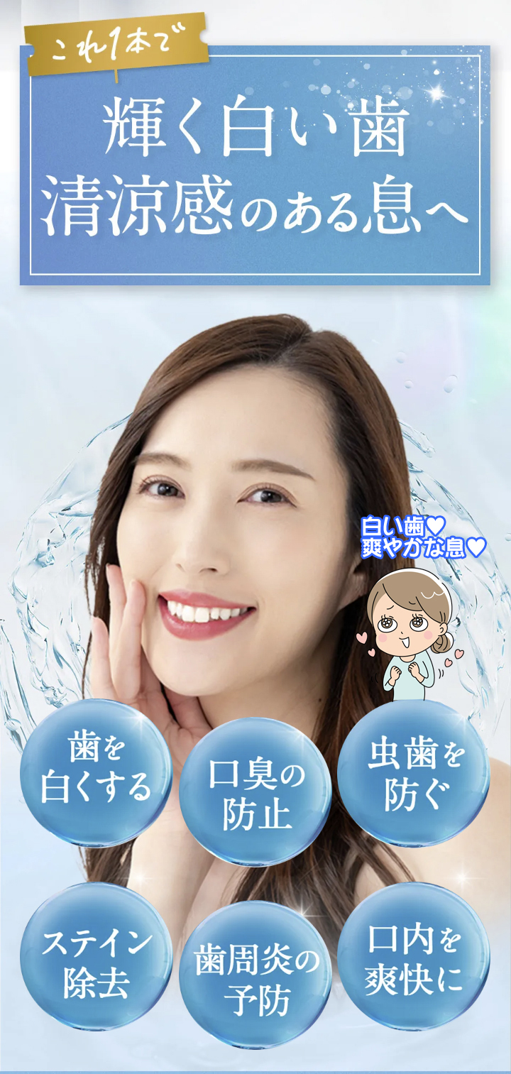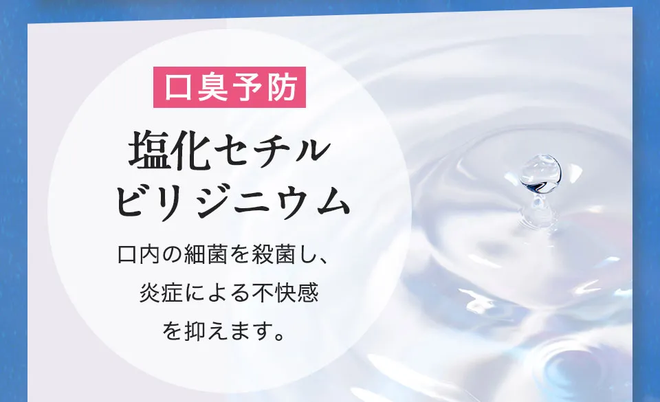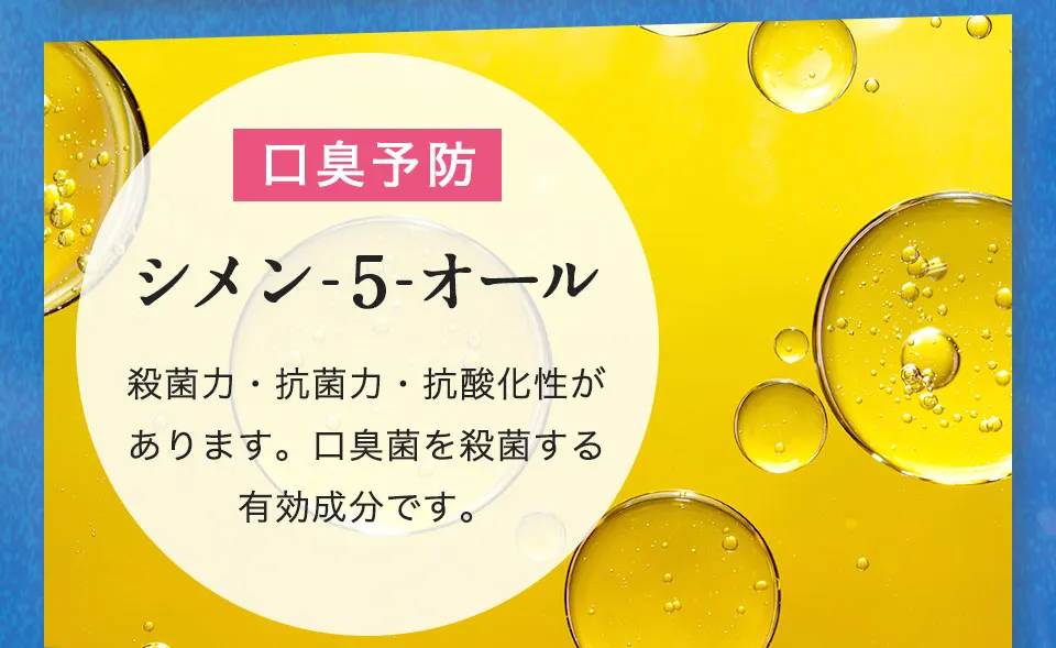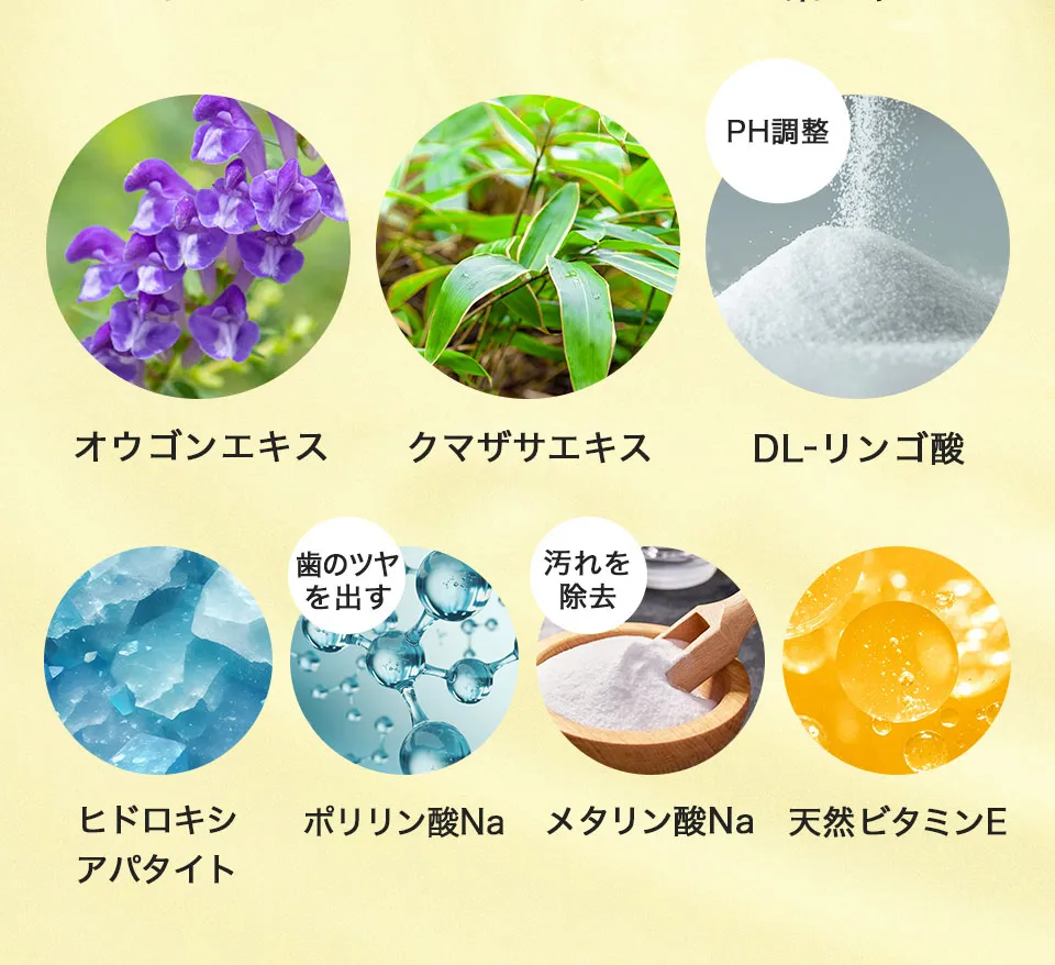 精製水、エタノール、無水エタノール、ヒドロキ シアバタイト [湿潤剤] 濃グリセリン、BG、ゴボ ウエキス、海藻エキス-4、酵母エキス-1、茶エキス-1、オウゴンエキス、クマザサエキス、桑エキス、ホップエキス、ポリアスパラギン酸Na液、ホエイ-2、1,2-ペンタンジオール、DL-リンゴ酸、オリブ油 [粘土調整剤]キサンタンガム、カルボキシメチルセルロースナトリウム[薬用成分] ポリエチレングリコール、フッ化ナトリウム、グリチルリチン酸2K、セチルピリジウムクロリド、シメン-5-オール [可溶化剤] POE・POPデシルテトラデシルエーテル[清涼剤] メントール[着香剤]香料[香味剤]ステビアエキス[保存剤]メチルパラベン [金属封鎖剤 ]メタリン剤Na [乳化剤] 水添大豆リン脂質[ 酸化防止剤]天然ビタミンE [ph調整剤] 無水 クエン酸、クエン酸Na[安定剤] ポリリン酸 Na