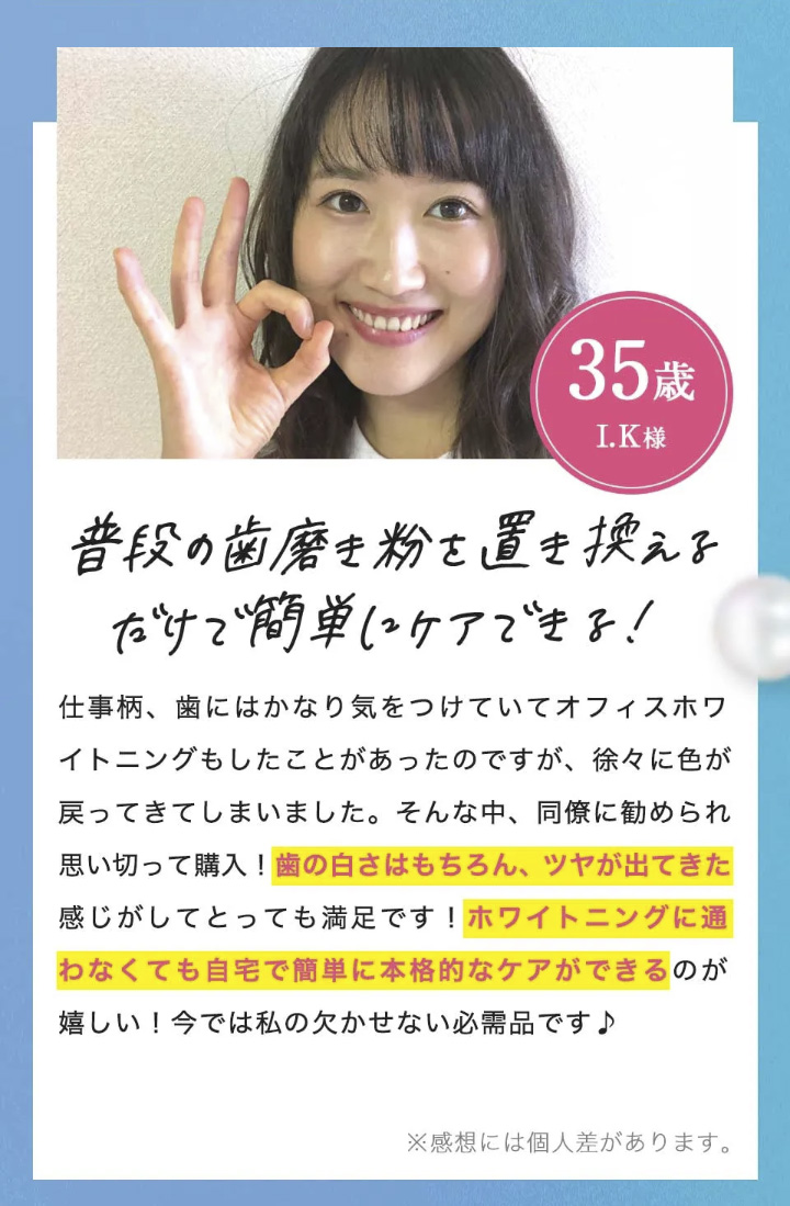 はい、歯の着色度合や日々の習慣により個人 差はありますが、継続して使用することでホワ イトニング効果が期待できます。